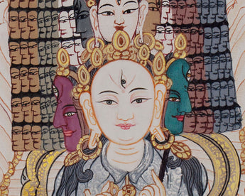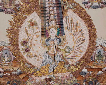 The White Umbrella Goddess, Protector Dukkar, is the powerful female god in Vajrayana Buddhism. She shows her power with her thousand heads, arms, and legs, and has eyes on the centers of every one of her hands and the bottoms of her feet.