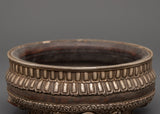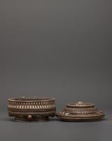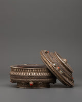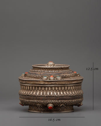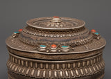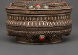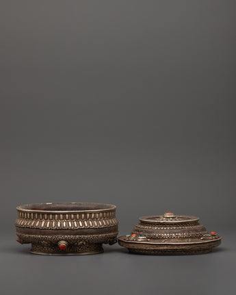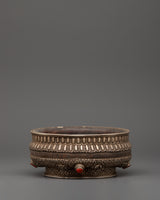 The pure silver casing heightens the vessel's sanctity and luminosity, while the original coral inlays provide spiritual protection and symbolic vitality. Each element in the design shows Himalayan artists' painstaking craftsmanship, demonstrating their cultural sensitivity and remarkable artisanship. This rice pot is great for daily puja, temple offerings, or as a focal point on your altar. It brings a profound feeling of solemnity and ageless beauty to any ceremonial setting, making it a prized possession for both devotion and show.