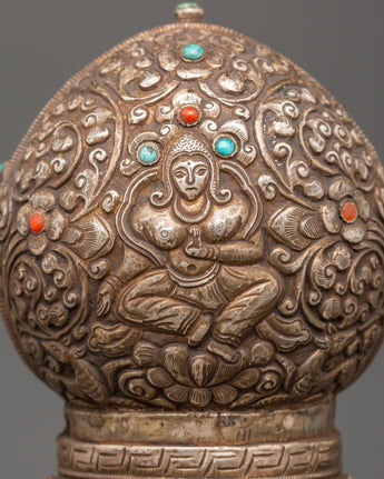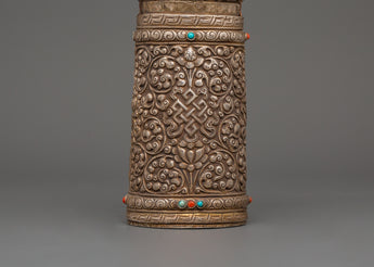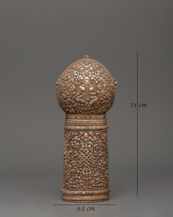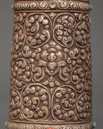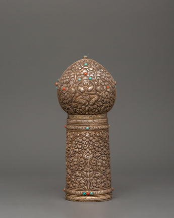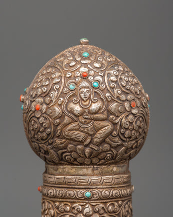 A magnificent handcrafted Tibetan ceremonial item, this Pure Silver Stamp stands 21 cm tall and 9.5 cm wide. Weighing 1.03 kilograms, it is a stunning blend of spiritual significance and artistic craftsmanship. The stamp features genuine turquoise and coral stones, which add elegance and vitality to the silver base. It is perfect for those looking to incorporate sacred ceremonies and Tibetan culture into their spiritual practices.