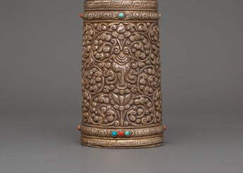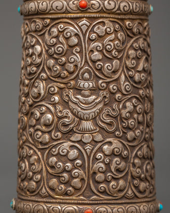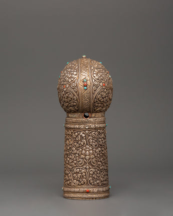 This Tibetan seal is historically used for blessing, cleansing, and consecration during rituals. Its sturdy silver body assures longevity, while the colorful turquoise and coral inlays look great and provide the stamp of spiritual vitality. It is a genuinely significant addition to any Tibetan shrine or meditation room, representing authenticity and purity.