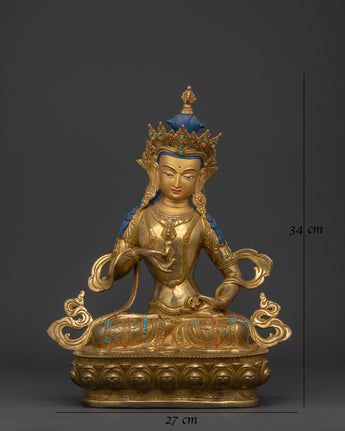 This magnificent 34cm Purification Deity Vajrasattva Statue in Tibetan Buddhism will enhance your sacred area. This 3.62 kilogram statue, which is made of gold-plated copper and embellished with imitation coral and turquoise stones, is a powerful representation of spiritual change and purification. This statue is a must-have for meditation areas and altar arrangements, as Vajrasattva is revered for his role in clearing obscurations and negative karma.