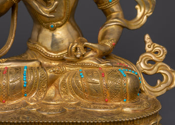 Exquisite workmanship highlights Vajrasattva's calm demeanor and ceremonial tools in this statue of him sitting on a lotus throne. His presence encourages enlightenment, inner tranquility, and spiritual clarity. The statue's spiritual aura is enhanced by the thoughtfully positioned coral and turquoise stones, which showcase Tibetan commitment and skill. This statue is ideal for collectors of genuine Buddhist art or practitioners looking to enhance their purifying rituals.