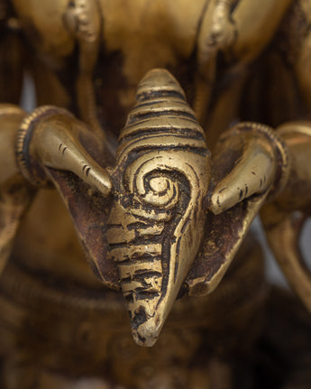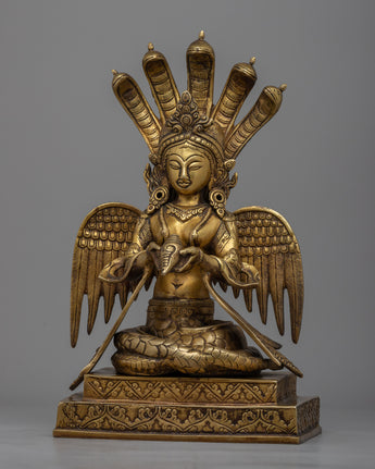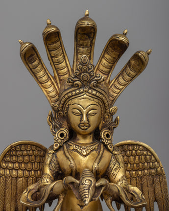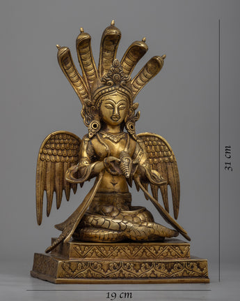 The Queen Snake Statue is a captivating and meticulously handcrafted piece of art made from brass. The statue portrays the Naga Kanya, a mystical serpent deity, seated gracefully upon a rectangular base. The intricate details of the sculpture, including the delicate facial features and the beautifully textured scales, bring the Naga Kanya to life. The wings extending behind her add an element of grace and power to the overall composition. This statue symbolizes the mystical and transformative qualities associated with serpents and is often revered for its protective and auspicious significance. It serves as a captivating and meaningful addition to any spiritual or decorative setting.