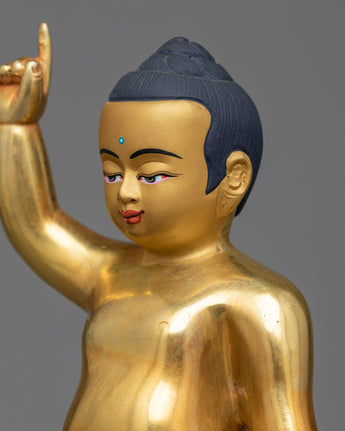 With his left hand pointing downward and his right pointing towards the sky, the Baby Buddha is portrayed in a stance that embodies his birth when he is claimed to have taken seven steps and declared his final reincarnation. This sculpture, with its radiant finish and intricate detailing, brings to life the auspicious beginnings of one who would become a guiding light for millions.