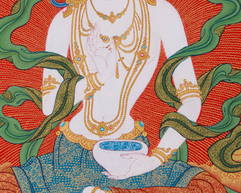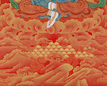 The use of rich red tones and shimmering gold accents enhances the Thangka's spiritual and visual impact, symbolizing her radiant energy and transcendent qualities. The dynamic composition and intricate details bring her sacred qualities to life, making it a powerful tool for meditation and spiritual practice.