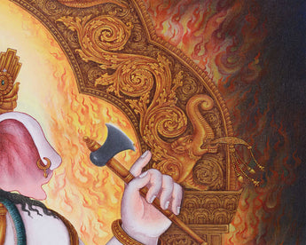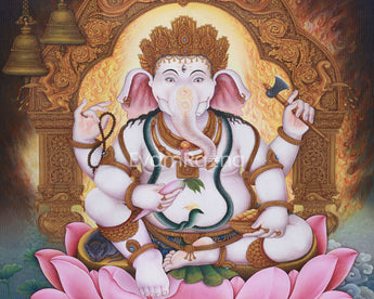 In this beautiful thangka, he is depicted with four arms, each holding meaningful symbols: a mala (prayer beads) for ongoing spiritual practice, a radish, which is a special Newar and Tantric symbol representing fertility and vitality, a modak sweet that stands for the rewards of devotion and inner happiness, and an axe to cut through ignorance and clear obstacles. He sits gracefully on a radiant lotus throne, surrounded by detailed florals and a golden halo that radiates divine energy. His kind yet powerful gaze, ornate crown, and flowing jewelry—adorned with shimmering gold—bring a sense of spiritual presence and artistic elegance. This thangka isn’t just a beautiful piece of art; it’s a sacred invitation for Ganesh’s protection, wisdom, and blessings for everyone who looks at it.