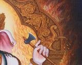 Radiating auspicious blessings and timeless artistry, this Lord Ganesh thangka elegantly displays sacred Himalayan workmanship. Hand-painted in the traditional Paubha style by a talented Nepali artist, it’s created on fine cotton canvas using rich acrylic pigments and enhanced with glowing 24K gold accents. Each step of its creation—from the intricate linework to the layering of vibrant colors, culminating in shimmering golden highlights—demonstrates incredible skill.