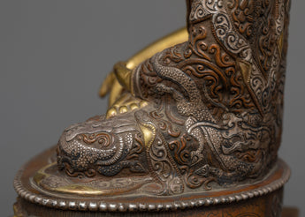The Ratnasambhava Buddha statue, a symbol of infinite generosity and the wisdom of equality, will take you on a spiritual journey of prosperity and equality. This statue, adorned with 24K gold gilding, silver plating, and meticulous gold and acrylic paintings, exemplifies the extraordinary workmanship of Patan's metal craftsmen. Crafted from oxidized copper, it emits timeless elegance and a profound spiritual atmosphere that adds to any space.