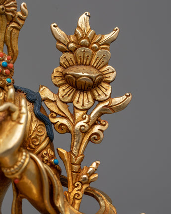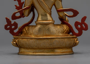 The sculpture is expertly crafted from a copper body, which was selected for its robustness and historical significance in the creation of holy items. The statue is then lavishly wrapped in 24K gold plating, which adds a sense of grandeur and purity to the warm tones of the copper. This gold layer not only enhances the sculpture's visual appeal but also symbolizes the divine energy and enlightened presence of Red Tara.