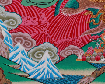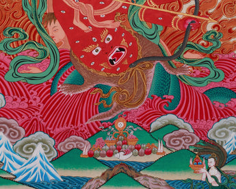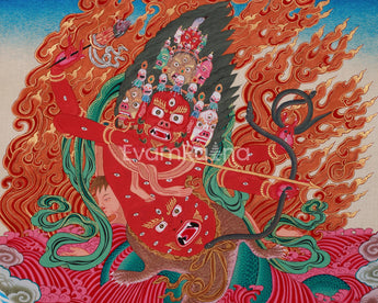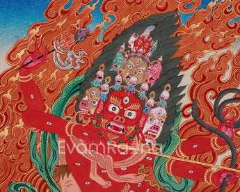 At the center of this thangka is Rahula, the fierce guardian of esoteric teachings in Tibetan Buddhism. With his vivid blood-red body and numerous eyes and mouths, he represents his all-seeing power and ability to consume spiritual obstacles. His snake-like form features a snake's lower body and a fierce face on its stomach, which absorbs negative energies. He has nine stacked heads, each emitting an intense awareness.