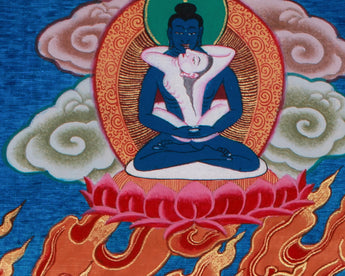 Rahula is surrounded by a blazing aura of fire, representing the incineration of delusion and negativity. Above him, Samantabhadra, the primordial Buddha, represents the unity of wisdom and emptiness. Nagkanya, the serpent maiden deity, makes ritual offerings at the bottom, representing the offering of worldly and elemental forces in service to the enlightened protector. This spiritually potent depiction is ideal for practitioners of Vajrayana Buddhism, collectors of sacred art, or anyone seeking to bring the protective force of Rahula into their space.