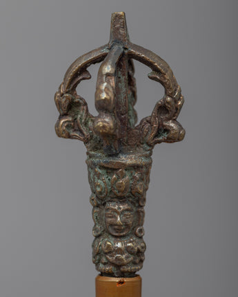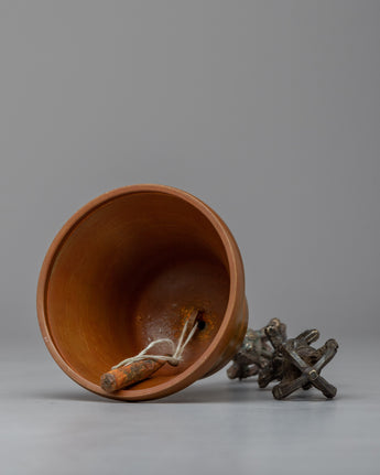 The Rare Vajra and Bell set is a magnificent display of traditional craftsmanship. This set embodies the sacred union of sound and symbol in Buddhist practice, handcrafted with precision on a bronze body. The bell's spiritual significance is enhanced by a beautifully painted sacral chakra. The vajra, which represents the indestructible nature of enlightenment, perfectly complements the bell. They work together to create harmonious vibrations and are effective tools for meditation and ritual ceremonies. This exquisite Vajra and Bell set is a valuable addition to the collection of any spiritual practitioner.