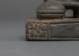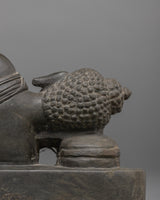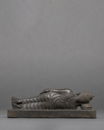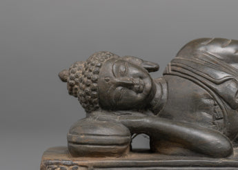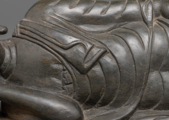 Our Reclining Buddha statue is hand carved in stone, with a serene look on the Buddha's face. The statue depicts him reclining on his right side with his head on his right elbow.
