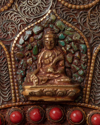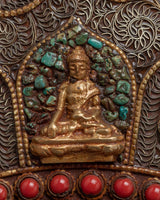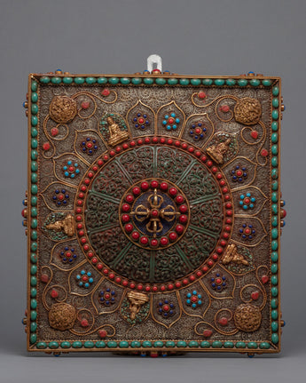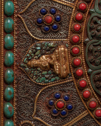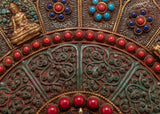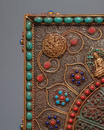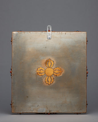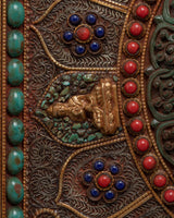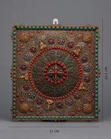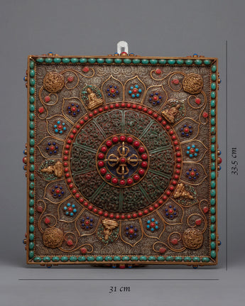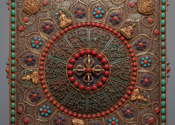 The Rectangle Mandala Art with a copper body is a lovely work of art. The Vishwa Vajra, a sign of enlightenment, is engraved in the middle of the mandala, with the four fortunate symbols carved around it. The gemstones are inlaid on the surface, adding to the piece's beauty and elegance. Mandalas are spiritual and ritual symbols that reflect the universe and the search for inner peace and harmony in Buddhism and Hinduism. This round mandala exemplifies the beauty and spirituality that these symbols represent.