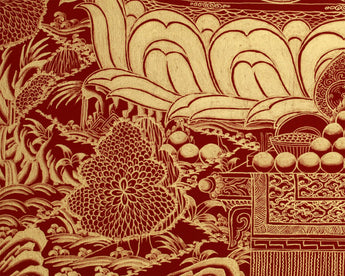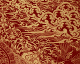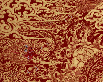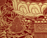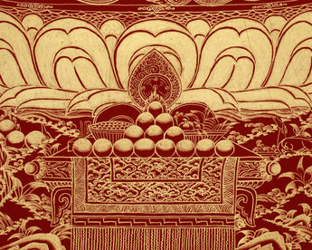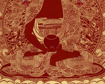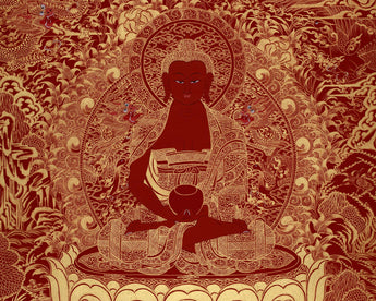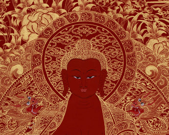 The Red Amida Buddha thangka represents Amitabha, the central figure of the Western Pure Land in Mahayana Buddhism. The Buddha is depicted in a serene state, symbolizing infinite compassion and spiritual liberation. It is painted in gold on a red canvas, while the Buddha's body and facial features are rendered in acrylic colors. The remaining elements, including his elaborate robe, lotus throne, clouds, landscape, and celestial motifs, are intricately created in gold. It enhances visual richness and symbolizes purity, vitality, and the sacred nature of Amitabha’s enlightened realm.