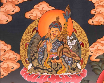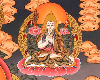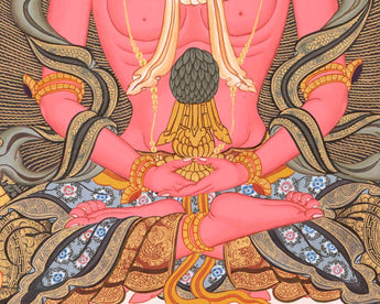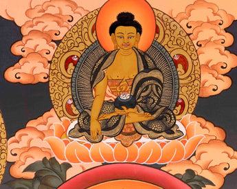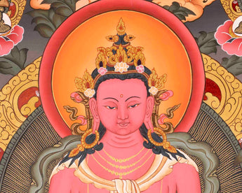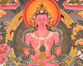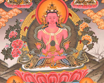 Amitayus, a heavenly Buddha connected to endless life, is shown in an Amitayus Buddha Thangka, a Tibetan Buddhist fabric painting. Amitayus is usually shown in Thangkas in a central position, frequently sitting and holding a container that holds the elixir of immortality. The artwork is revered as a holy depiction of the Buddha's attributes of compassion and long life, and it is used as a visual aid for meditation. Like other Thangkas, an authentic hand-painted Thangka of Amitayus Buddha is prized for its rarity and spiritual importance.