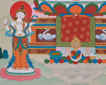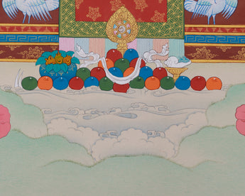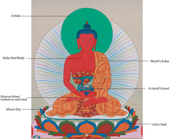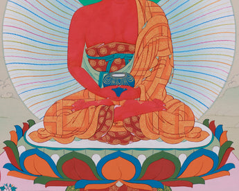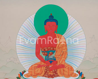 The Red Buddha Amitabha Thangka is a stunning Tibetan sacred art piece, hand-painted with vibrant acrylic colors and 24K gold. The traditional Karma Gadri style, known for its spacious compositions and fine detailing, is masterfully applied in this artwork. The vibrant acrylic colors create a dynamic quality, while the 24K gold accents add divine luminosity, symbolizing spiritual enlightenment. The Karma Gadri style emphasizes balance and harmony, making it a visually and spiritually compelling piece.