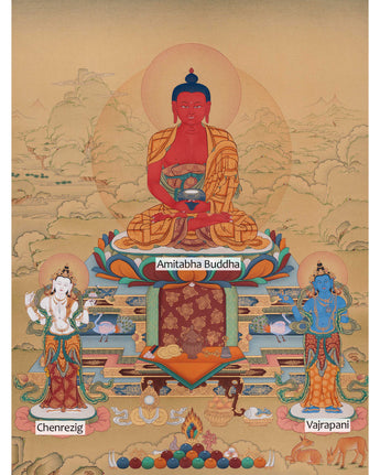 Tibetan Red Buddha Amitabha Thangka | Featuring Chenrezig and Vajrapani | A Timeless Buddhist Painting of Wisdom