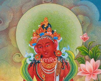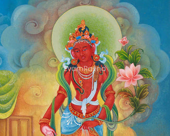 The High-Quality Chenrezig Thangka Print embodies the divine presence of Avalokitesvara, also known as Chenrezig, in exquisite detail and vibrant colors. Crafted with meticulous care, this print captures the essence of compassion and wisdom revered in Tibetan Buddhism. Avalokitesvara, depicted in a traditional seated posture, emanates a sense of tranquility and compassion, inviting viewers into a space of spiritual contemplation and reverence. Each brushstroke reflects the devotion of the artist, ensuring that every aspect of Avalokitesvara's form is rendered with precision and authenticity. Whether as a focal point for meditation or a decorative piece, the High-Quality Chenrezig Thangka Print serves as a powerful reminder of the boundless love and compassion that Avalokitesvara embodies, inspiring devotees on their spiritual journey towards enlightenment and liberation from suffering.