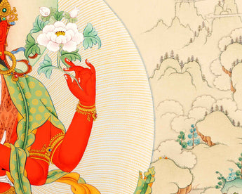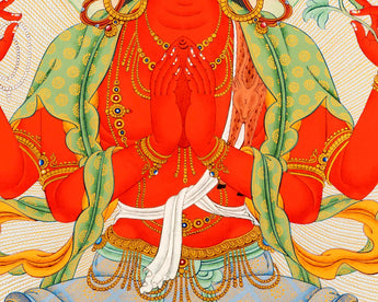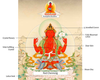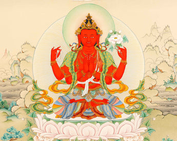 This is a high quality print of Red Chenrezig thangka, also known as Gyalwa Gyasto. This rare form of Chenrezig is depicted here in radiant red color. On the top is Buddha Amitabha.