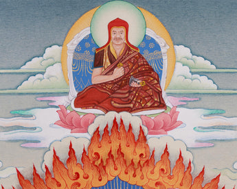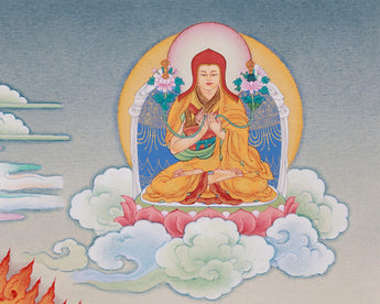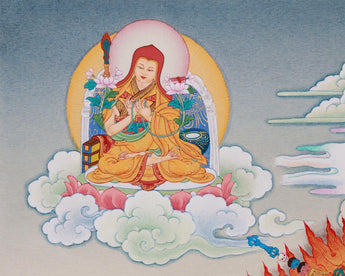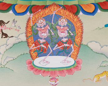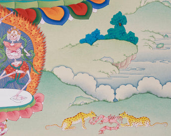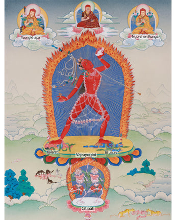 The Khatvanga that Vajrayogini holds represents the unity of wisdom and compassion, essential components of the Vajrayana path. Above Vajrayogini, revived Buddhist Masters are depicted, symbolizing the blessings and guidance of past enlightened beings who help practitioners on their journey towards spiritual liberation. Below, Chitipati Guardian resides, representing the protection and wisdom that arise from overcoming external and internal obstacles on the path to enlightenment.