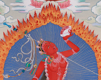 The Red Dakini Vajrayogini Thangka powerfully illustrates the fierce and transformative energy of the Goddess, who embodies both wisdom and spiritual strength. This hand-painted artwork, crafted on cotton canvas using natural stone colors and authentic 24K gold, follows the esteemed Karma Gadri style, celebrated for its vibrant details and spiritual richness. In the Thangka, Vajrayogini is depicted in a lively dancing stance, symbolizing the flow of wisdom and energy. She stands atop Kalarati and Bhairav, which signifies the sacred union of wisdom and method. A halo of blazing wisdom fire encircles her, representing the eradication of ignorance and the cleansing of negative emotions.