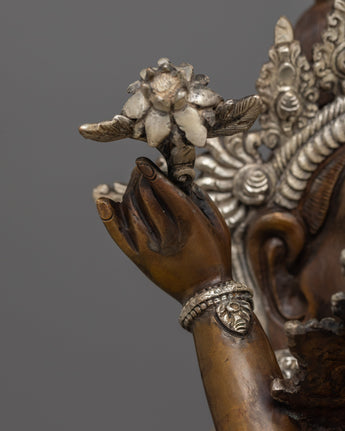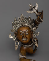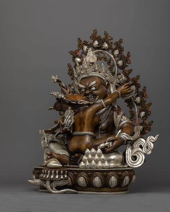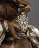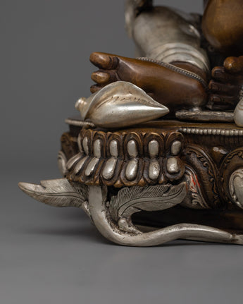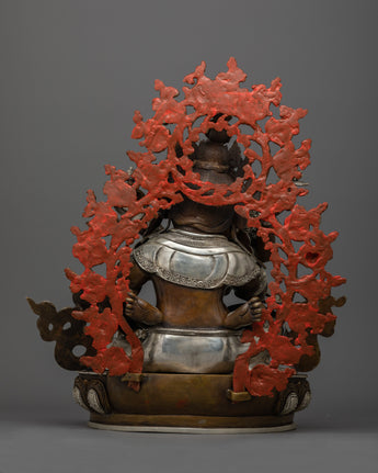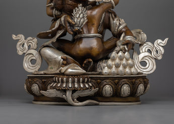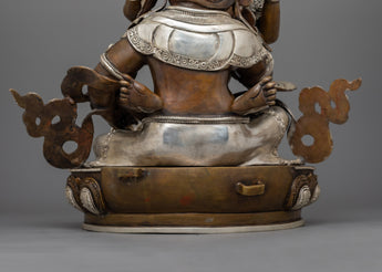 This handcrafted Red Dzambhala with Consort Vasudhara Statue is precisely made from oxidized copper and silver-plated, representing the profound meaning of wealth, protection, and success. Dzambhala, the Tibetan riches deity, is renowned for his capacity to alleviate poverty and provide material and spiritual prosperity.