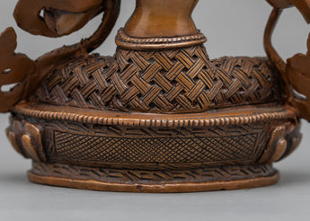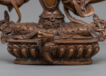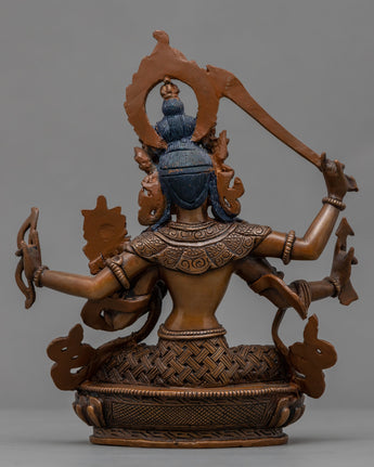 The classic Black Manjushri Mantra Practice Statue in Himalayan Style was expertly hand-carved in our studio. We are the skilled craftsman of the Kathmandu Valley, and we have been producing classic Vajrayana sculptures for many years. The statue shows the Manjushri seated with his legs crossed, holding a lotus in his left hand and a knowledge sword in his right. We utilized copper that had been oxidized to form the god. Since we hand-carved every little detail of the god, it took us more than a month to finish the statue's design, building, and polishing.