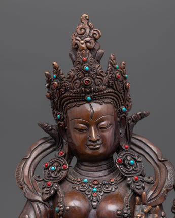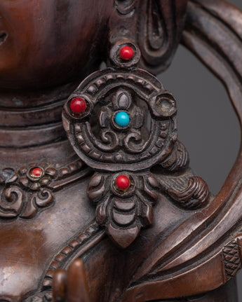 Standing at 12.2 inches in height, Red Tara is depicted seated in a posture of poise and power. Her right hand holds a vase, while her left hand holds a lotus, which has a bow and arrow on top of it. Her expression reflects strength and compassion, embodying her role as a protector and guide.