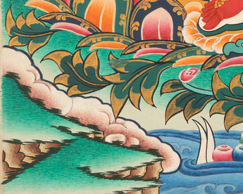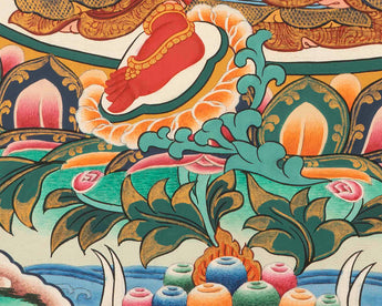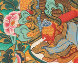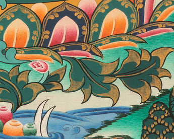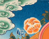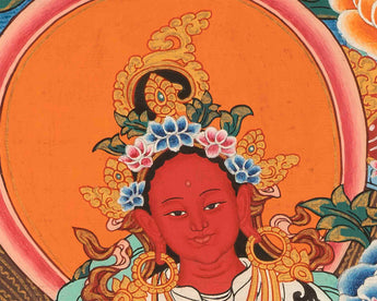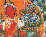 The thangka of Red Tara, in her red appearance, is seated on a lotus seat upon a giant leaf that seems to be floating on the water. She visualizes the serene nature wearing precious ornaments and multicolor silks. Unhappy lovers idolize her, and she is particularly adept at attracting men and women. Repeating her mantra ten thousand times will fulfill all of one's wishes.
