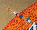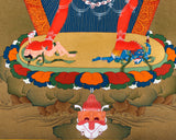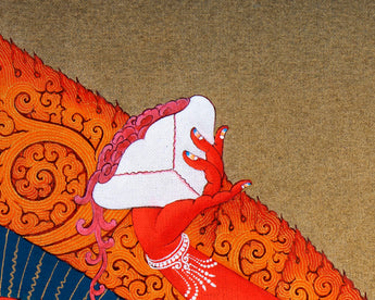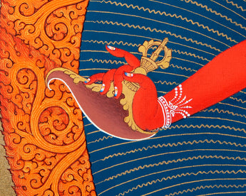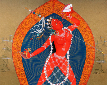 The most popular tantric deity in Vajrayana practice is Vajrayogini, a Dakini. This Red Vajrayogini thangka art is made of genuine 24K gold and natural stone colors. She's also known as 'The Powerful divine Red Lady,' seated on a sun disc. She wears a skull necklace and flags the knife with one hand while holding a skull cup. The vajrayogini practice and mantra are incredibly profound and essential in Vajrayana.