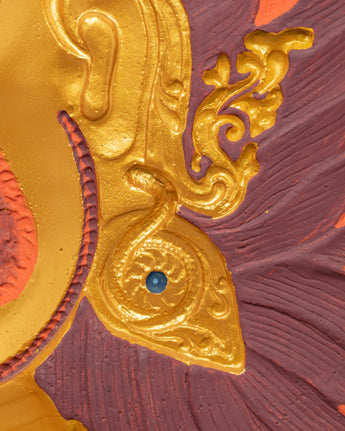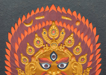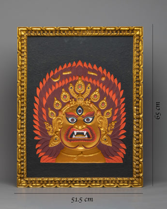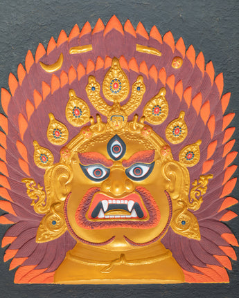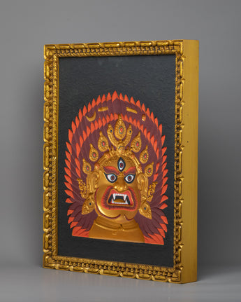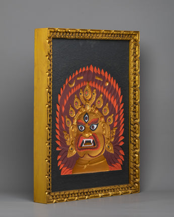 Bhairava is a fierce form of the Hindu god Shiva. This relief artwork in the wooden ply of Bhairava Head is a beautiful and intricate representation of the deity. The head is crafted from clay and is mounted on a wooden base. The artwork is framed with a fiber border. The piece is a stunning example of art and would make a great addition to any home or collection.