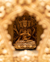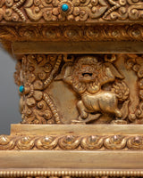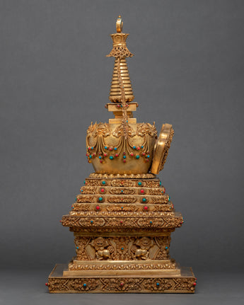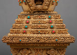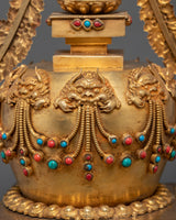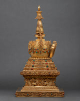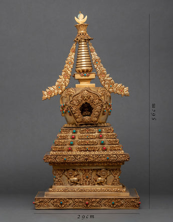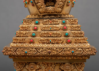 The Buddha Stupa is beautifully hand-carved for the Buddhist Shrine. The stupa is coated with 24K genuine gold. The Coral is placed at the stupa's base in the center of the Vajra. A stupa is a Square structure containing Buddhist relics. The blue Coral is placed at the top of the jewel and the moon, which makes the stupa very beautiful. At the center, you can see the beautiful staue placed.