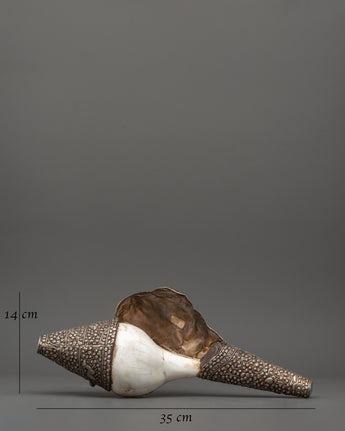 The holy conch shell (Shankha) is a sacred Tibetan Buddhist ritual object representing Dharma, purity, and spiritual awakening dissemination. This conch, which is traditionally utilized in temple ceremonies, meditation, and holy offerings, symbolizes divine energy and spiritual transformation. It stands 14cm tall and 35cm wide, making it a formidable ritual weapon and a gorgeous altar centerpiece.