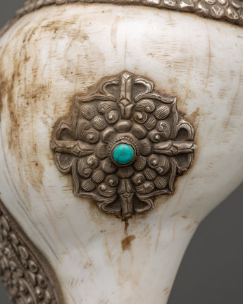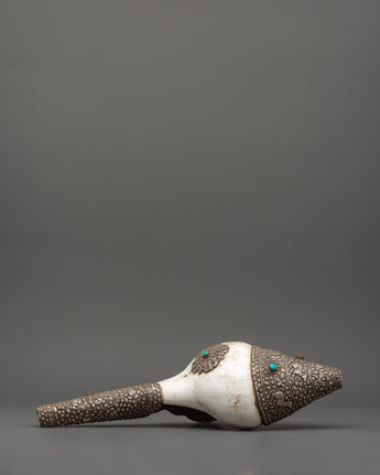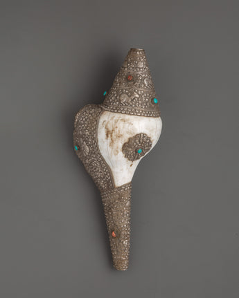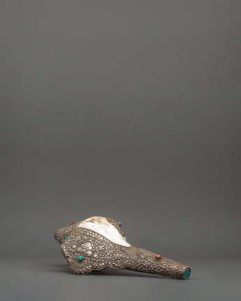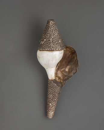 This conch shell was expertly carved and silver-plated, giving it a brilliant and mystical aspect. Weighing 1.248kg, it has a strong yet balanced feel, making it suitable for prayer rituals, temple use, and as a sign of divine protection. Whether used in spiritual ceremonies, on home altars, or as a one-of-a-kind Buddhist gift, this Tibetan conch shell represents purity, knowledge, and enlightenment.