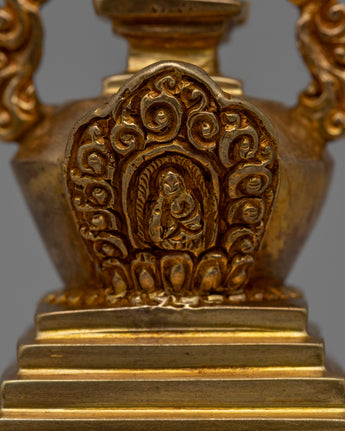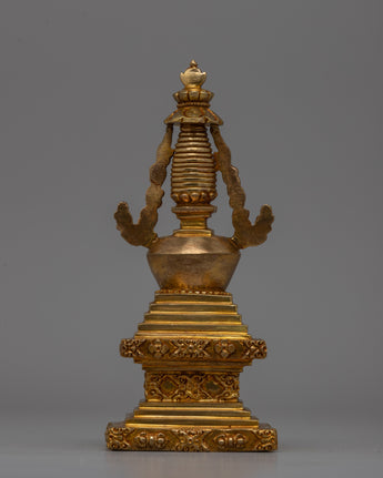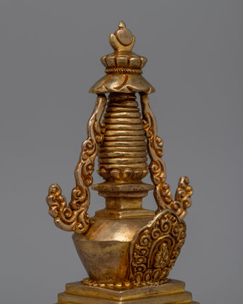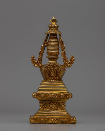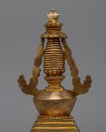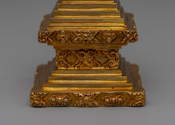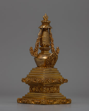 This Religious Décor Gold-Plated Stupa, made of copper, symbolizes Buddhism's sacred teachings and the path to enlightenment. Its square foundation represents stability, while the floral-patterned dome symbolizes the essence of life and the one truth. The harmika depicts the Buddha's enlightened intellect, while the spire with 13 rings represents the stages of spiritual attainment. This stupa, topped with a flame of eternal wisdom, serves as a powerful reminder of eternity and spiritual growth.
