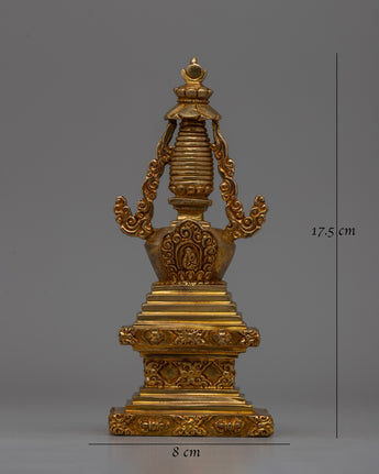 This handcrafted stupa, perfect for meditation, prayer, or as an altar centerpiece, incorporates the five elements of earth, water, fire, air, and space into its intricate design. Its golden shiny and elaborate decorations evoke majesty and reverence, making it a beloved emblem of dedication and meditation.