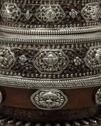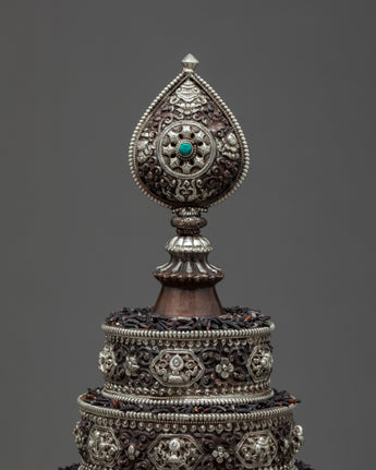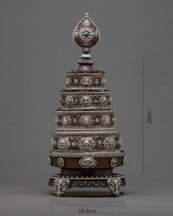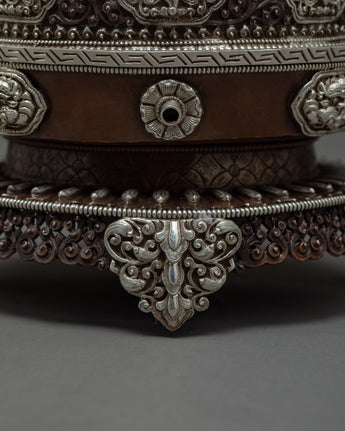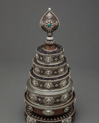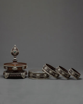 This traditional mandala set is made of pure silverplating decorated with stone and has beautiful hand engraving of different symbols. The carving details are done very finely throughout the Mandala Set. This beautifully hand engraved Silver Mandala Set.