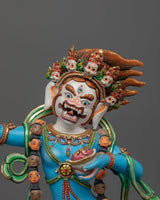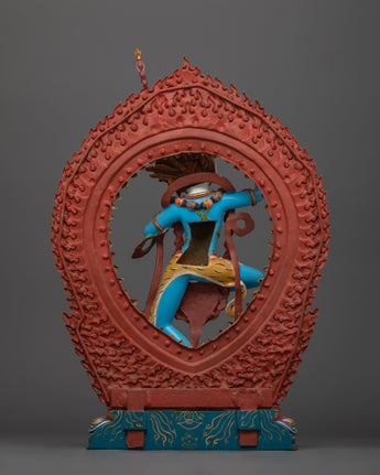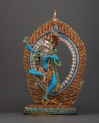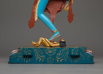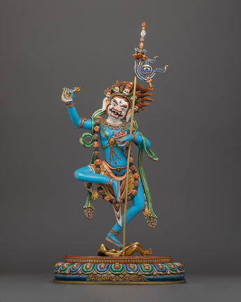 The sculpture depicts Simhamukha in a dynamic pose, her lion's face representing the courageous declaration of the truth and the power to protect the Dharma. Her appearance, which is frequently represented with a flaying knife and a skull cup, indicates the transformation of negative energy into knowledge and compassion. This statue not only serves as an object of veneration but also as a reminder of the strength that comes from confronting and transforming our inner fears and challenges.