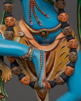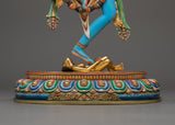 The Lion-Faced Dakini-Singhamukha Yogini Statue which is 16.7 inches (42.5 cm) tall and weighs 3.97 kg, depicts Singhamukha's strong presence with spiritual reverence and fine craftsmanship made of copper and adorned with 24K gold gilding symbolizing Simhamukha's strong and protective spirit.