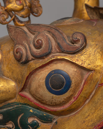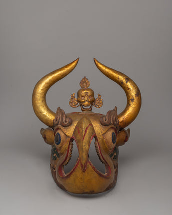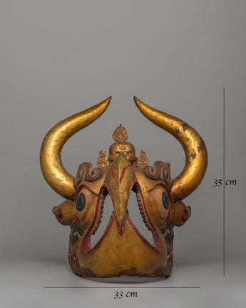This Repousse Copper Mask is a handcrafted Tibetan wall-hanging artifact made from a gold-plated copper body that is 35 cm in height and 33 cm in width. This mask is used in Buddhist ceremonies, meditation areas, and temples to symbolize spiritual strength, wisdom, and heavenly protection. Such masks are a necessary aspect of holy décor for altars, monasteries, and homes since they are traditionally thought to repel evil energy and draw in divine favors.