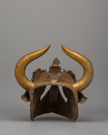 With its elaborate repousse metalwork and symbolic engravings that convey the strength of guardian deities, this gold-plated Tibetan mask exhibits traditional Himalayan workmanship. It features beautiful facial expressions. This powerful and elaborate mask, which weighs 2.434 kg, can be utilized in religious events, put on walls, or displayed in areas used for meditation. This Tibetan repousse mask displays spiritual energy and traditional craftsmanship, whether it is worn for meditation, ritual, or as a remarkable piece of cultural art.