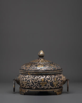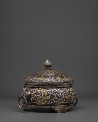 The Rice Carry Pot with Silver Inlaid is made of iron for strength, and it has gorgeous silver and brass inlay work that adds to its visual appeal. The mix of iron and precious metals not only extends the pot's life but also adds cultural depth, making it suitable for both daily usage and spiritual rites. The brass inlaid detailing contrasts well with the silver accents, giving this pot a focal point in any home or religious space. It's ideal for keeping rice during ceremonies or as a unique cultural decor piece. This Rice Carry Pot with Silver Inlaid is more than just a storage solution; it represents craftsmanship and heritage. The combination of iron, silver, and brass produces a rich, cultural aesthetic, making it ideal for those who value good craftsmanship and classic design. This Rice Carry Pot with Silver Inlaid is more than just a storage solution; it represents craftsmanship and heritage. The combination of iron, silver, and brass produces a rich, cultural aesthetic, making it ideal for those who value good craftsmanship and classic design.