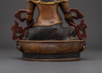 This gold-plated Dzambhala statue, weighing 3.86 kg, possesses a substantial and revered presence, making it an ideal choice for creating a sacred space that fosters financial growth and spiritual reflection. The oxidized copper base complements the old look while keeping the potent connotation of plenty. This rich fortune statue is not only a devotional object, but it also emits electromagnetic magnetism, attracting prosperity, charity, and karmic abundance into your life and home.