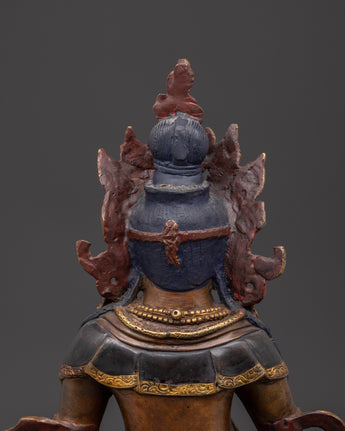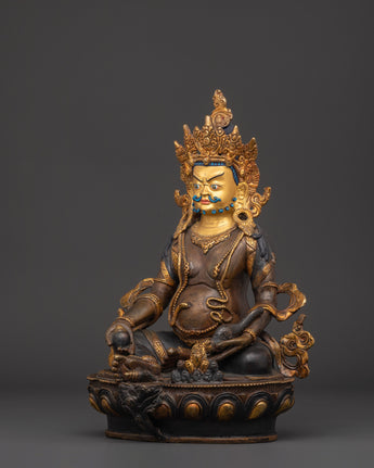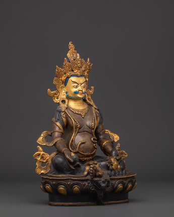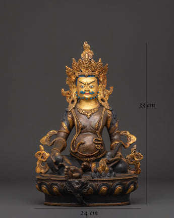This Rich Fortune Dzambhala Statue is a striking depiction of the Buddhist deity of prosperity and abundance. Standing 33cm tall and made of oxidized copper with gold plating, this religious figure represents prosperity, fortune, and protection from poverty. Dzambhala is renowned in Vajrayana Buddhism for his ability to alleviate financial difficulties and bestow both worldly and spiritual wealth upon practitioners. This statue's meticulous design and strong presence make it suitable for personal altars, meditation spaces, or ceremonial offerings.