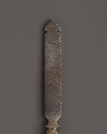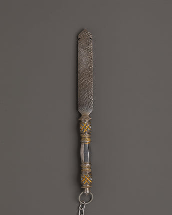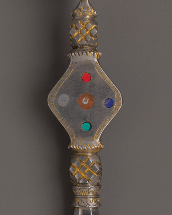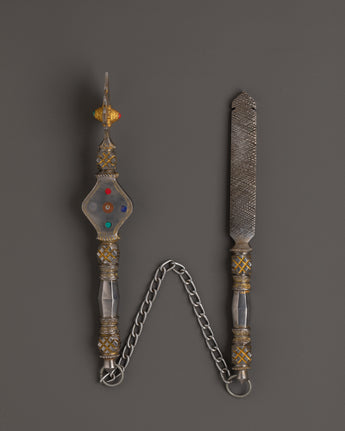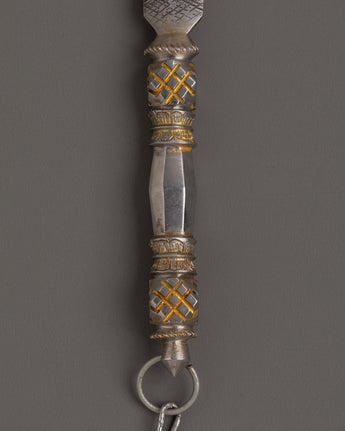 Richen Daru is a ritual set made up of a knife and a spoon used by the Newar community in Nepal. Typically composed of iron, the set has intricate gold and silver ornamentation. The knife, known as a 'Chhuri,' is used ritually to chop food during traditional ceremonies, such as weddings, bratabandha, and other religious occasions. The spoon, known as a 'Chamcha,' is used for serving. The Richen Daru set represents affluence and is an essential cultural relic that is frequently passed down through generations as a family legacy.