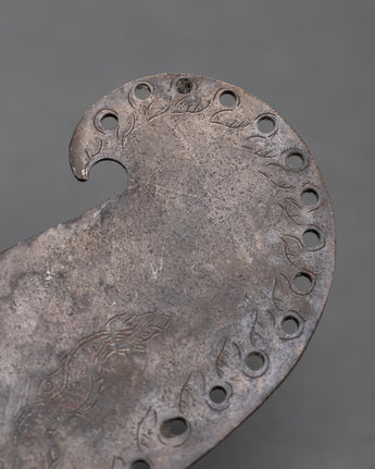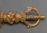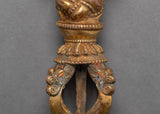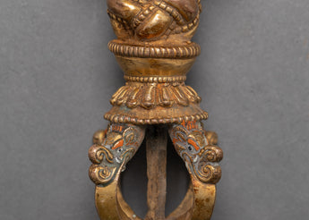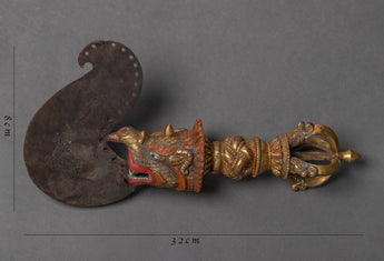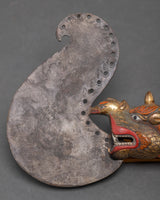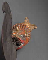 This Ritual Flaying Knife is made of the Copper Body with 24k gold plated. The artist crafted the knife with a crescent moon blade and a stamp shaf. The Makara with vajra is acrylic painted. The word Kartika in Sanskrit means, chopper, which is exactly the manner one would expect its mechanics to work, it very much seems to have evolved from a utilitarian hunter’s knife considering the large skinning rounded broad blade.