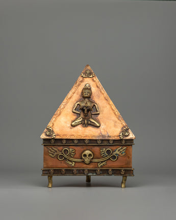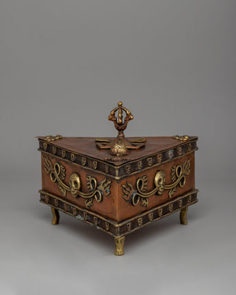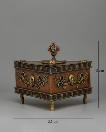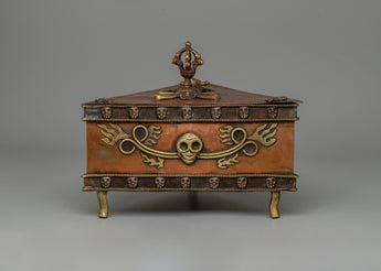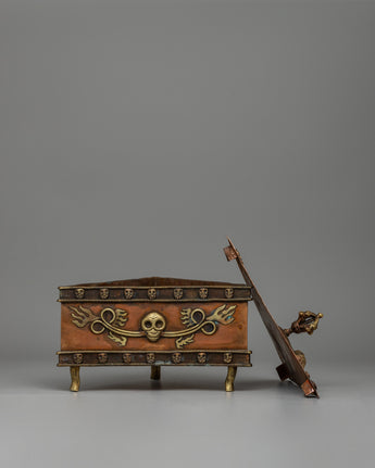 With this Handcrafted Ritual Implements Set, you may embrace the beauty of Tibetan creativity and spirituality. It also includes a lovely treasure box for storage. Each item is made of copper and brass, with detailed embellishments that evoke traditional Tibetan workmanship. The set comprises a range of ceremonial implements used in Buddhist rituals, representing protection, knowledge, and dedication. The treasure box, which measures 18 cm in height and 22 cm in breadth and weighs 2.62 kg, acts as both a safe container and a beautiful masterpiece, with elaborate skull designs and brass accents.