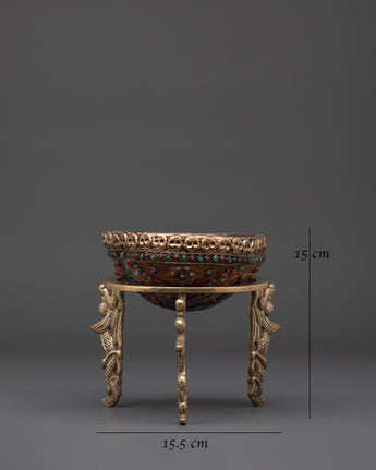The Ritual Kapala Cup is a sacred tantric offering vessel essential to Tibetan Buddhist Vajrayana ceremonies. Expertly crafted from brass, acrylic color, copper, and adorned with artificial turquoise and coral stones, this cup measures 15 cm in height, 15.5 cm in width, and 19 cm on each side, weighing 0.82 kg. Its intricate design showcases ancient Himalayan artistry, while the lustrous silver-plated surface enhances its spiritual significance. Symbolizing the transformation of negative energies and worldly attachments into enlightened wisdom and compassion, this kapala is a vital tool for advanced spiritual practitioners seeking deeper connection and profound inner transformation during their rituals.