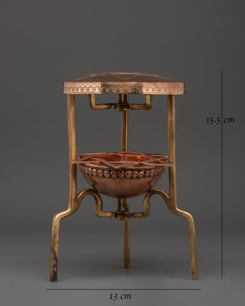 This Ritual Kapala Star, a potent ceremonial item painstakingly created from copper, will elevate your holy ceremonies. The actual kapala star, which is 5 cm tall and 11.5 cm wide with a 13.5 cm side width, is meant to symbolize spiritual metamorphosis and divine geometry. The kapala is a sacred ceremonial instrument used for attracting higher energies, making offerings, and engaging in deep meditation. It is symbolic in both Tibetan and Eastern traditions. This combination gives your altar or meditation area presence and balance with its matching 25.5cm tall stand and 16cm diameter circle base.